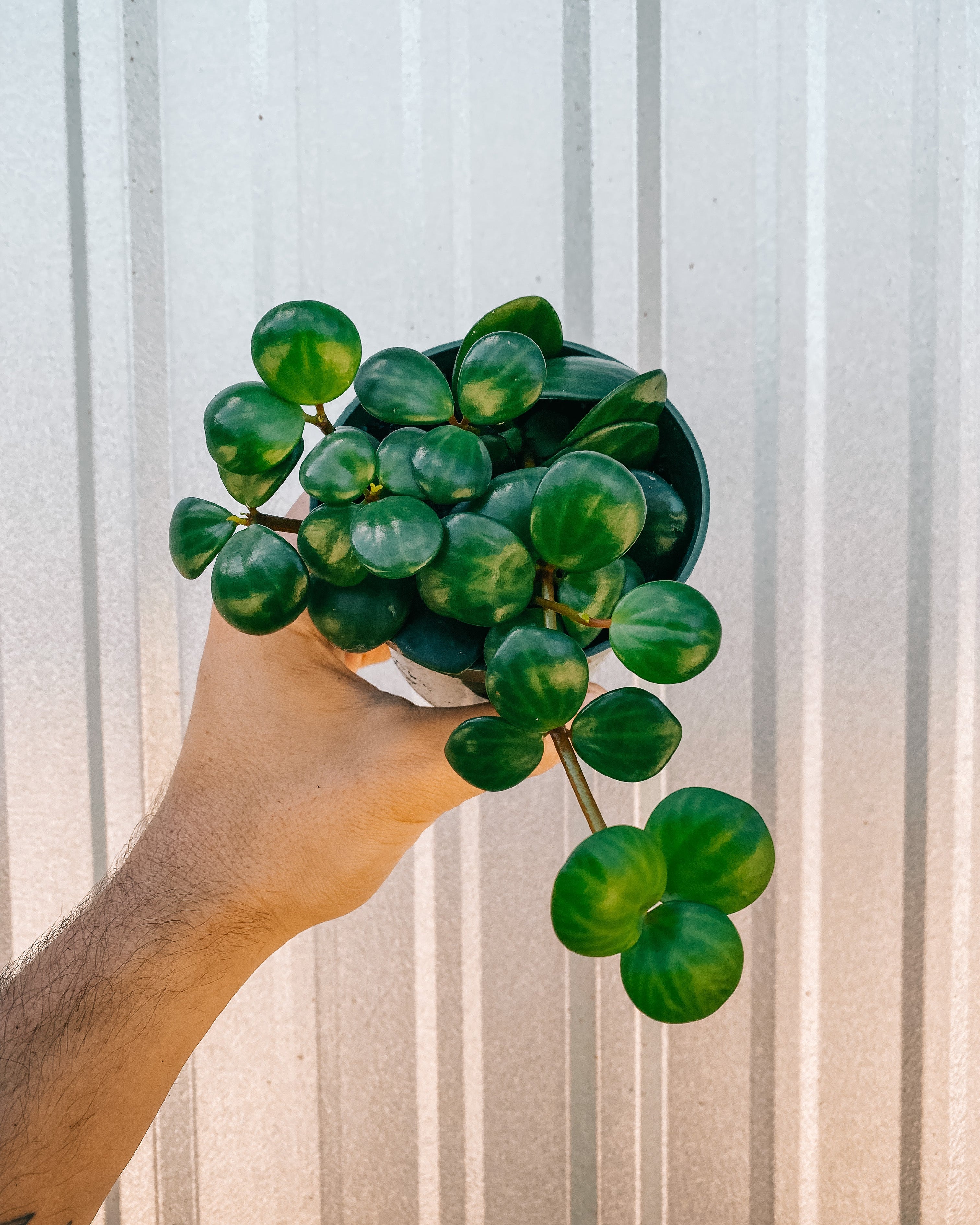Peperomia 'Hope' is a trailing variety with small, round, succulent-like leaves that grow in pairs along soft, arching stems. The foliage is thick and slightly glossy, storing moisture and giving the plant a fuller look as the vines lengthen. It stays compact at the base while gently cascading over the edge of a pot, making it an easy choice for shelves or hanging planters.