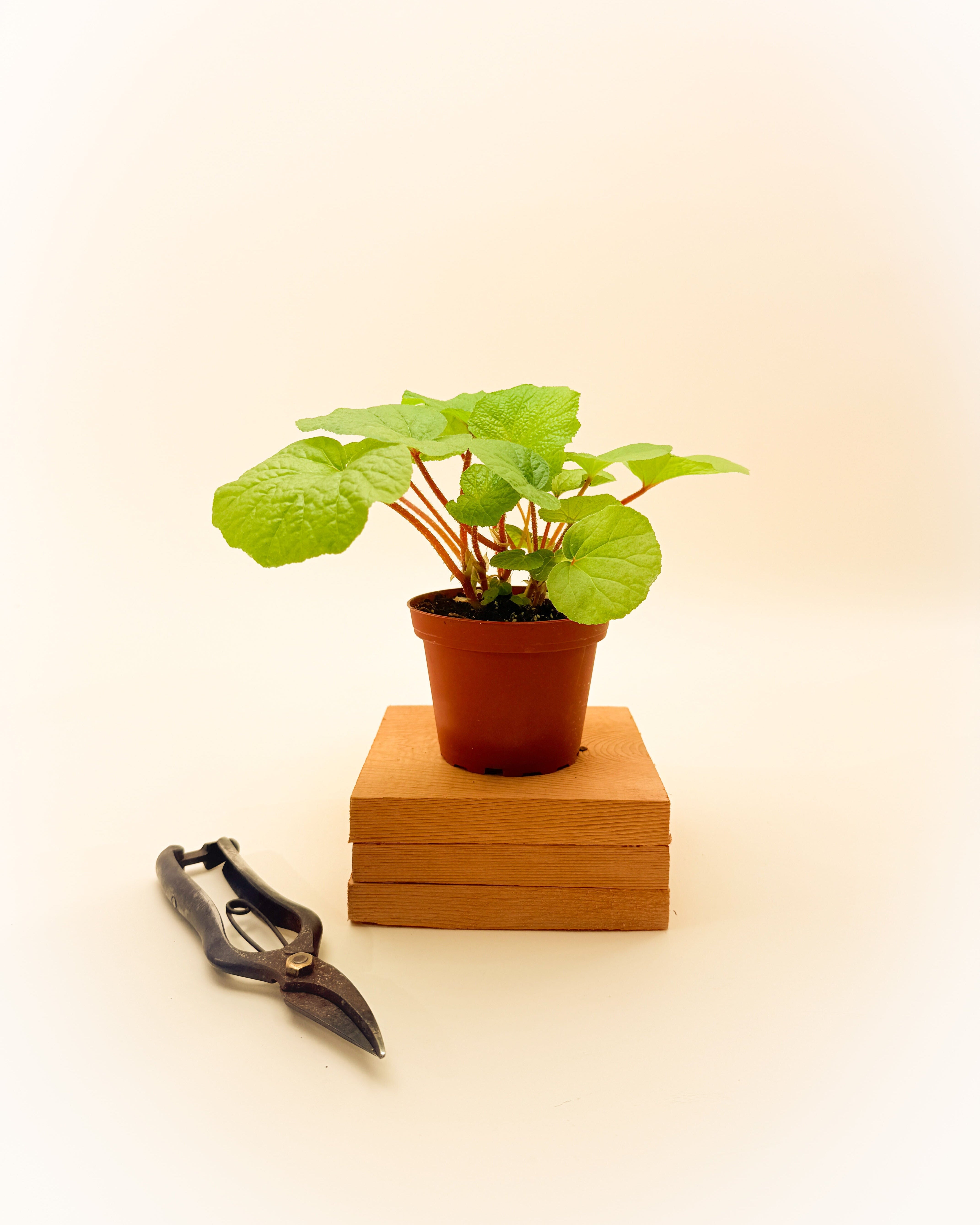 Begonia ‘Paleata’ grows in a low, shrubby form with softly rounded, apple-green leaves flushed with red along the veins and petioles. The surface has a fine, slightly fuzzy texture that catches the light just enough to highlight its gentle color variation. Over time, it fills out into a lush mound and may produce delicate white blooms if it’s especially happy.